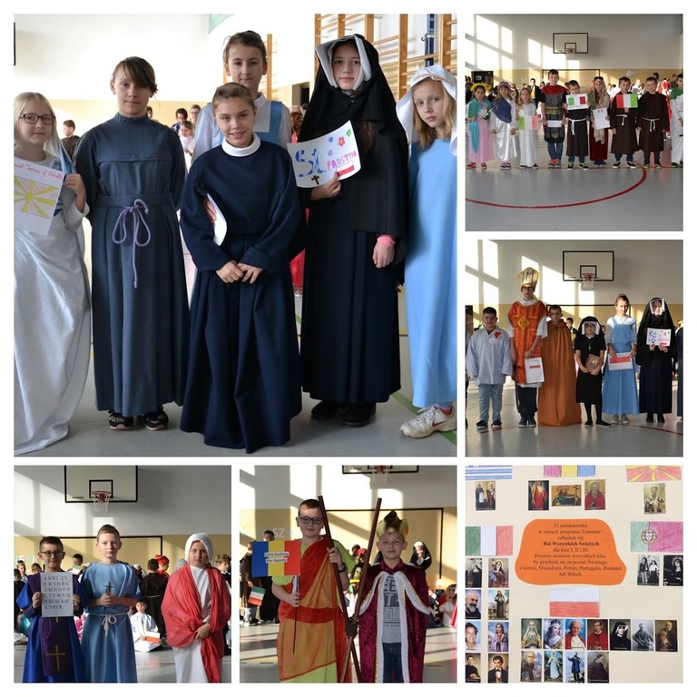 W ramach projektu międzynarodowego Erasmus+, 31 października br., nauczycielka religii p. Iwona Gorol zorganizowała na terenie naszej szkoły „Bal wszystkich świętych”. Zanim jednak do niego doszło, każdy uczeń wybrał jednego świętego pochodzącego z krajów partnerskich, tzn. z Włoch, Portugalii, Grecji, Macedonii, Rumunii oraz Polski, następnie przeanalizował jego żywot, by się w końcu za niego przebrać. Finałem akcji był przemarsz „wszystkich świętych” korytarzami naszej szkoły oraz wspólna zabawa na sali gimnastycznej. Bal cieszył się ogromnym zainteresowaniem wśród uczniów.