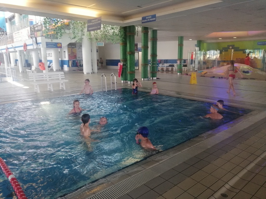 i wyzwalały wiele pozytywnych emocji wśród uczestników. Przyczyniły się do lepszego poznania i integracji dzieci. W tym dniu dzieci miały również okazję do rozwijania zdolności przez zajęcia recyklingowe pt. „Morski świat”. W kolejnych dniach dzieci wykonywały wiele ciekawych prac plastycznych, między innymi: malowanie na koszulkach, wykonanie biżuterii z makaronu, zabawy z użyciem kredy czy obraz wymarzonych wakacji. W czasie półkolonii dzieci dwa razy wyjechały do Aqua Parku w Tarnowskich Górach. Uczestnicy przez dwie godziny mogli korzystać ze wszystkich atrakcji oraz wykazać się umiejętnością pływania.