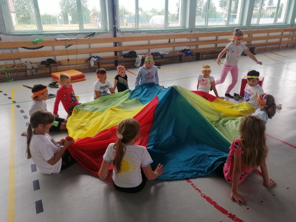 Pierwszy dzień został zaplanowany tak, aby uczestnicy półkolonii lepiej się poznali. Zabawy integracyjne, a zwłaszcza te z chustą animacyjną budziły ogromne zainteresowanie