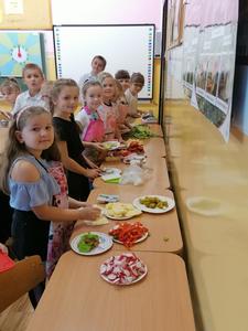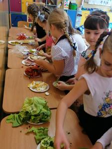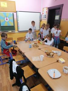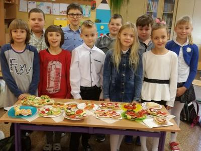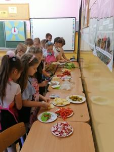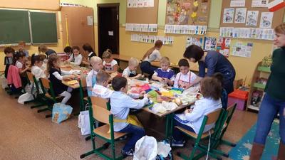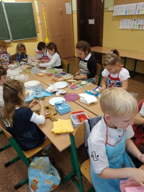 Z tej okazji w klasach były przeprowadzane śniadania edukacyjne, w czasie których nauczyciele przekazali najmłodszym cenne informacje na temat zdrowego odżywiania.