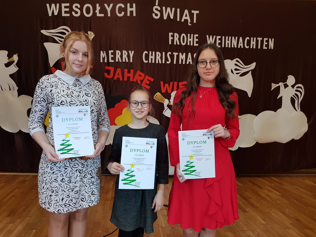 Zuzanna Janus i Kamilla Szopka kolędą „Still, still, still” wyśpiewały I miejsce w kategorii duety klas IV-VIII, natomiast Judyta Fabiańczyk utworem pt. „O wei, wei, wei Weihnachten” uzyskała III miejsce w kategorii soliści klas IV-VIII.