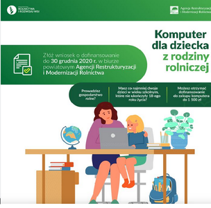 Rodzina prowadząca gospodarstwo rolne, w skład której wchodzi co najmniej dwoje dzieci w wieku szkolnym, które nie ukończyły 18. roku życia może ubiegać się o dofinansowanie zakupu komputera stacjonarnego lub przenośnego do kwoty 1500 zł.
