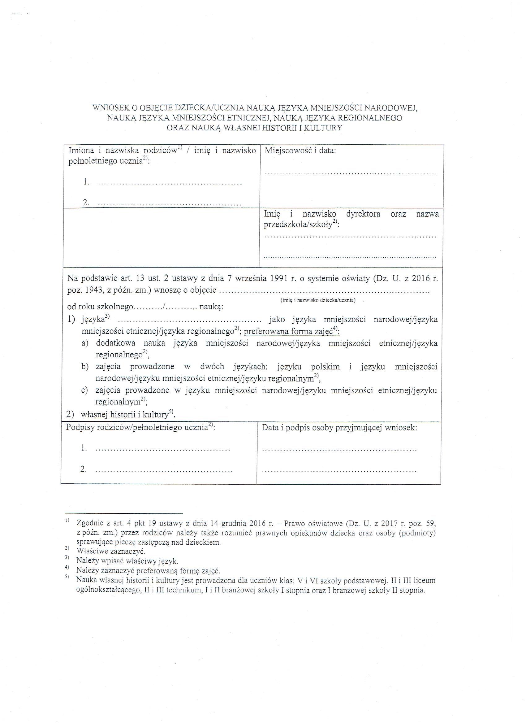 Państwa dziecko od nowego roku szkolnego 2021/2022 może uczęszczać na dodatkową naukę języka mniejszości narodowej – języka niemieckiego (nie wymaga się przynależności do mniejszości). Jeżeli rodzic podejmie decyzję o nauce języka niemieckiego, musi być świadomy, że będą to 3 godziny tygodniowo ( obowiązkowe )dla dziecka, zaś ocena będzie wliczana do średniej. Do utworzenia grupy w danej klasie musi zdeklarować się minimum 7 uczniów. Raz złożony wniosek* obowiązuje do końca szkoły podstawowej.