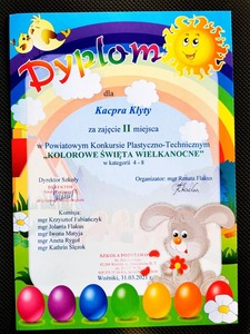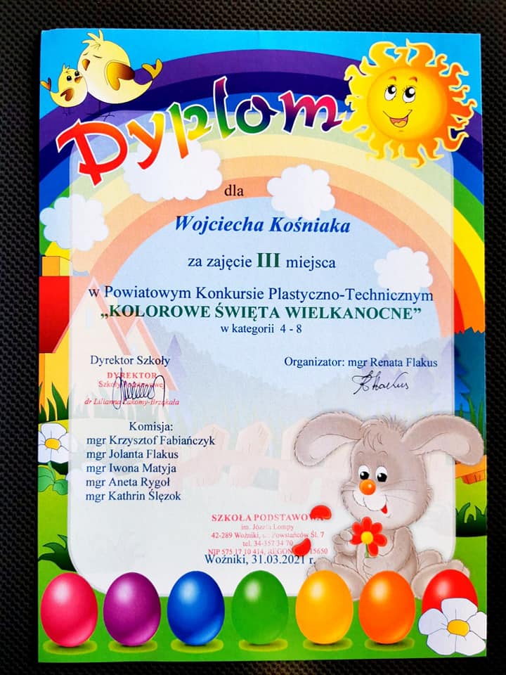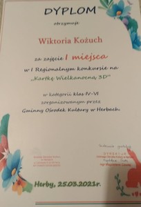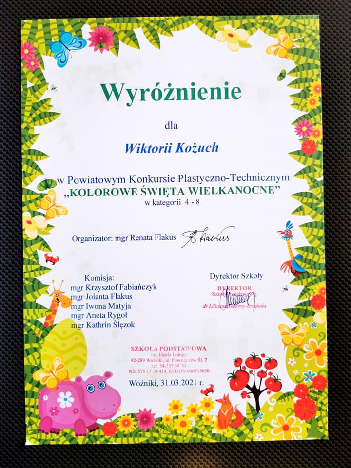 Wiktoria Kożuch uczennica klasy VI b zdobyła I miejsce w I Regionalnym Konkursie Plastycznym na Najpiękniejszą Kartkę Wielkanocną 3D w kategorii IV-VI. Na konkurs wpłynęły aż 363 kartki, a Wiktoria wykazała się wielkim talentem i pomysłowością.