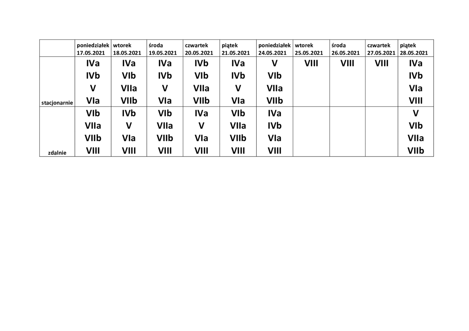 Od poniedziałku 17 maja 2021 r. do piątku 28 maja 2021 r., klasy IV – VIII, przechodzą na hybrydowy sposób nauczania.