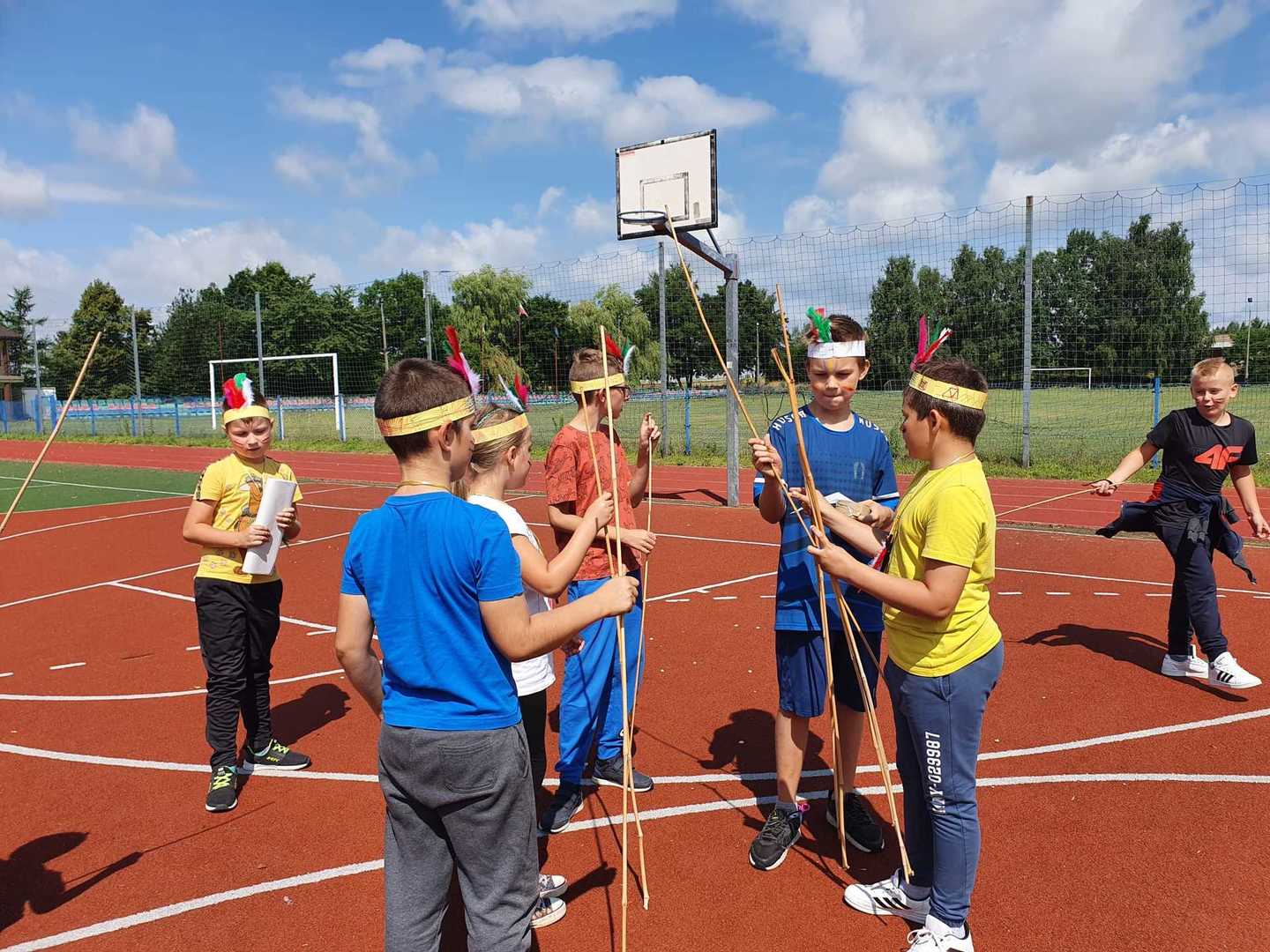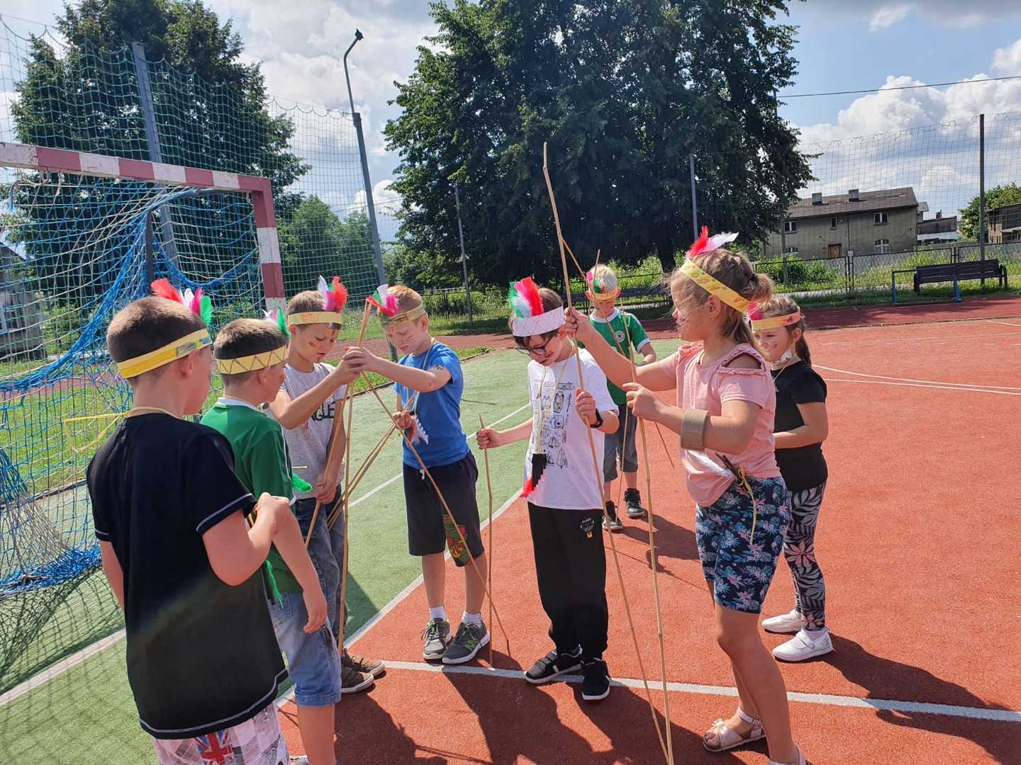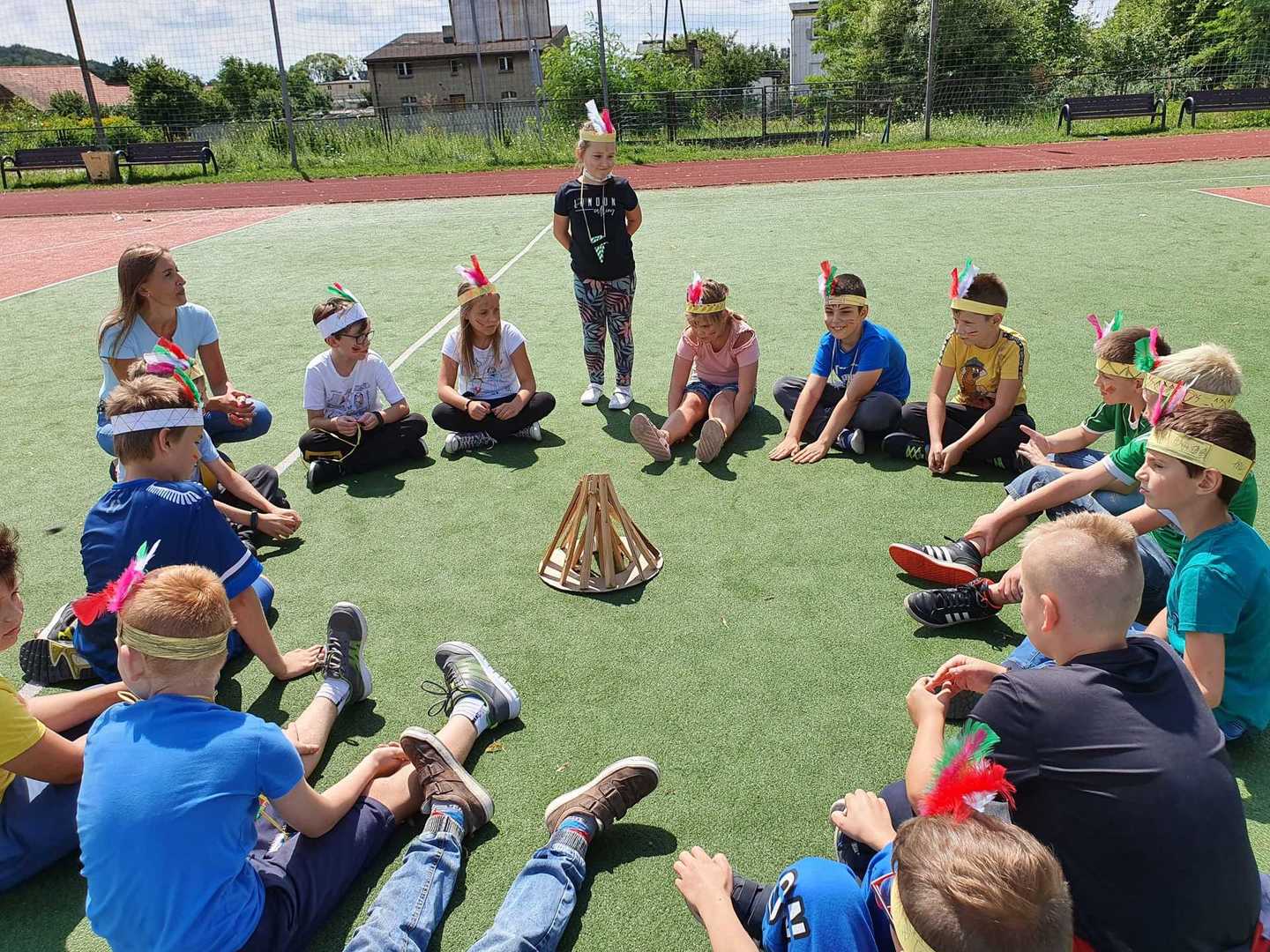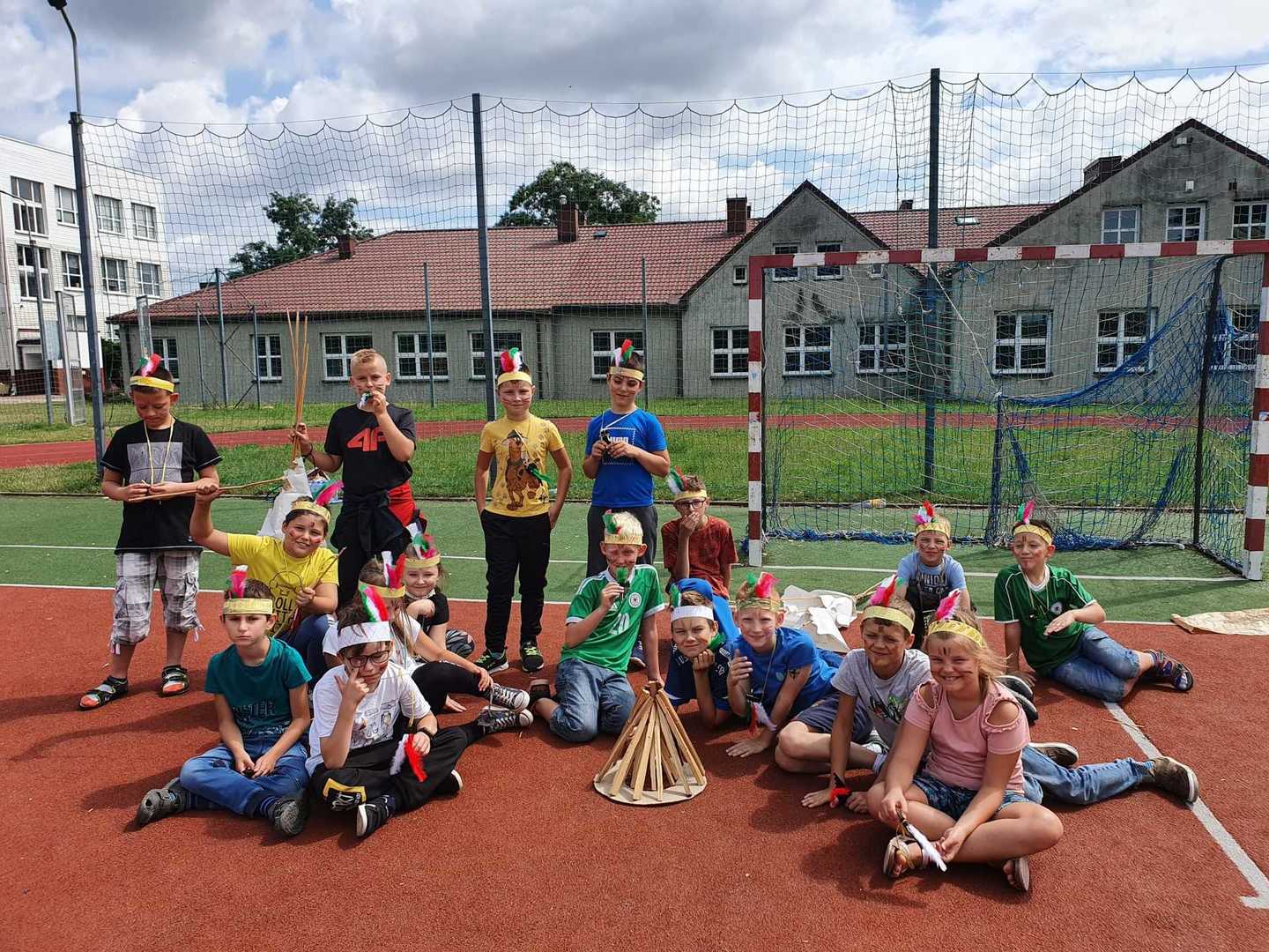 Następnie wszyscy udaliśmy się na szkolne boisko, gdzie próbowaliśmy stworzyć indiańską wioskę i zbudować tipi.