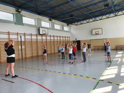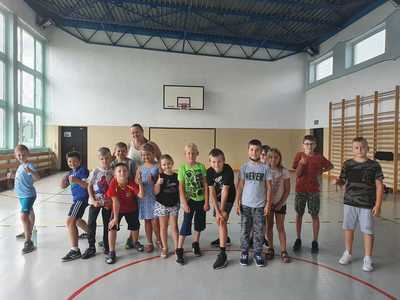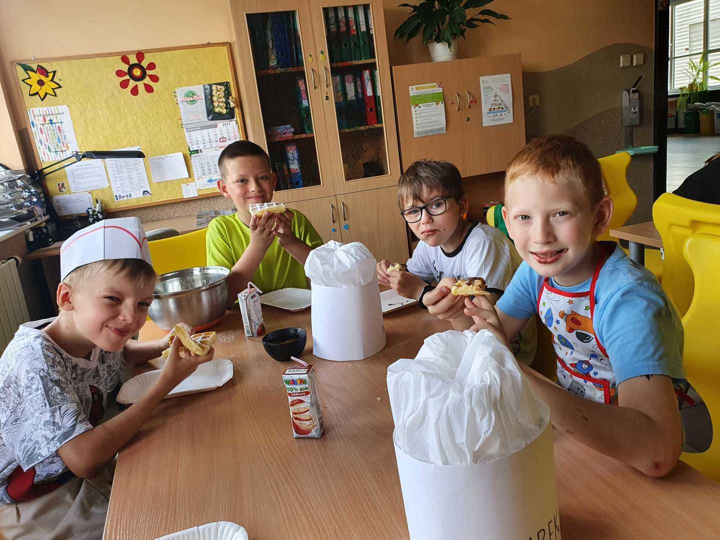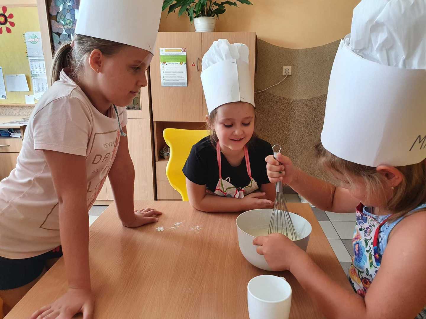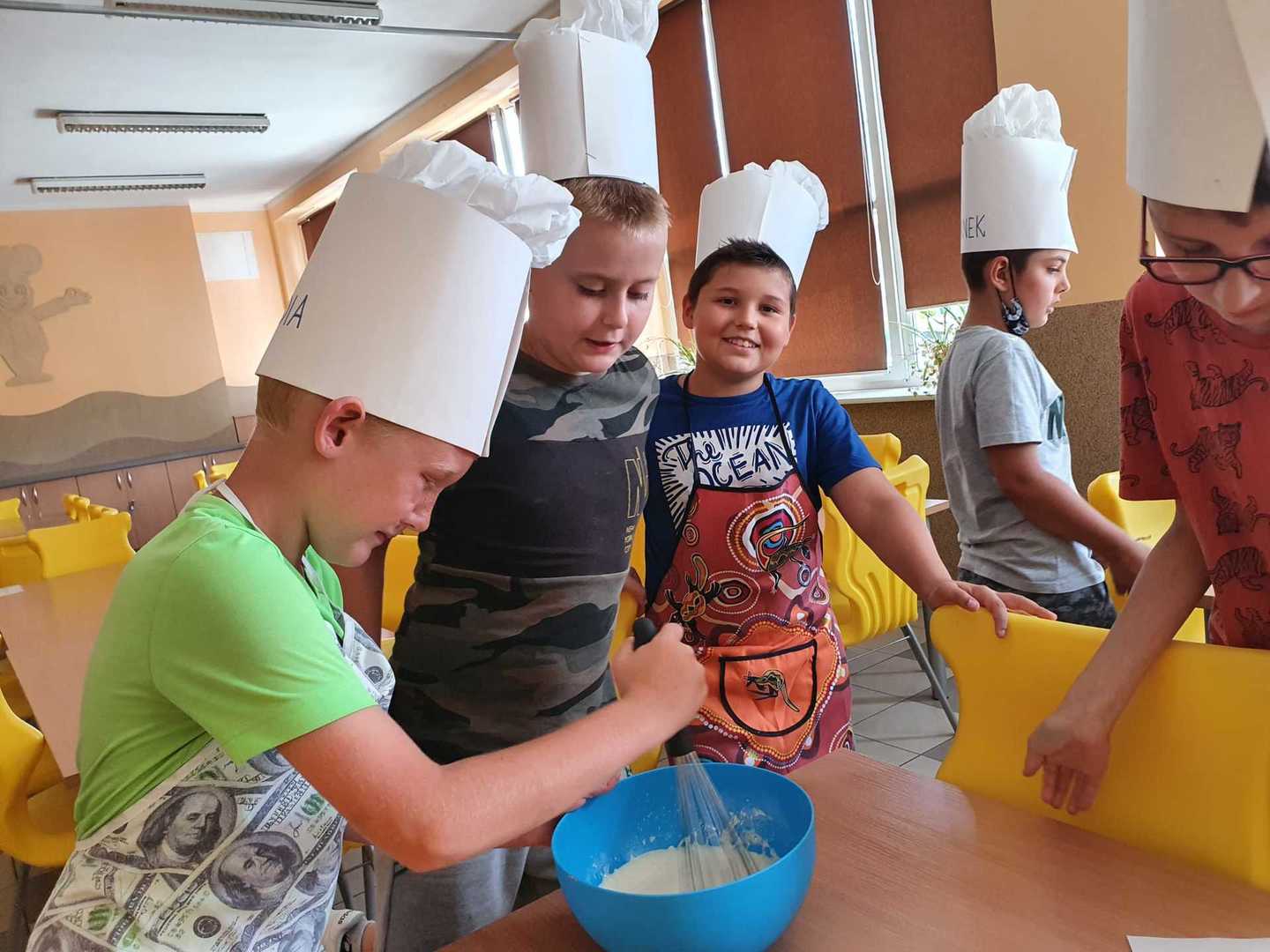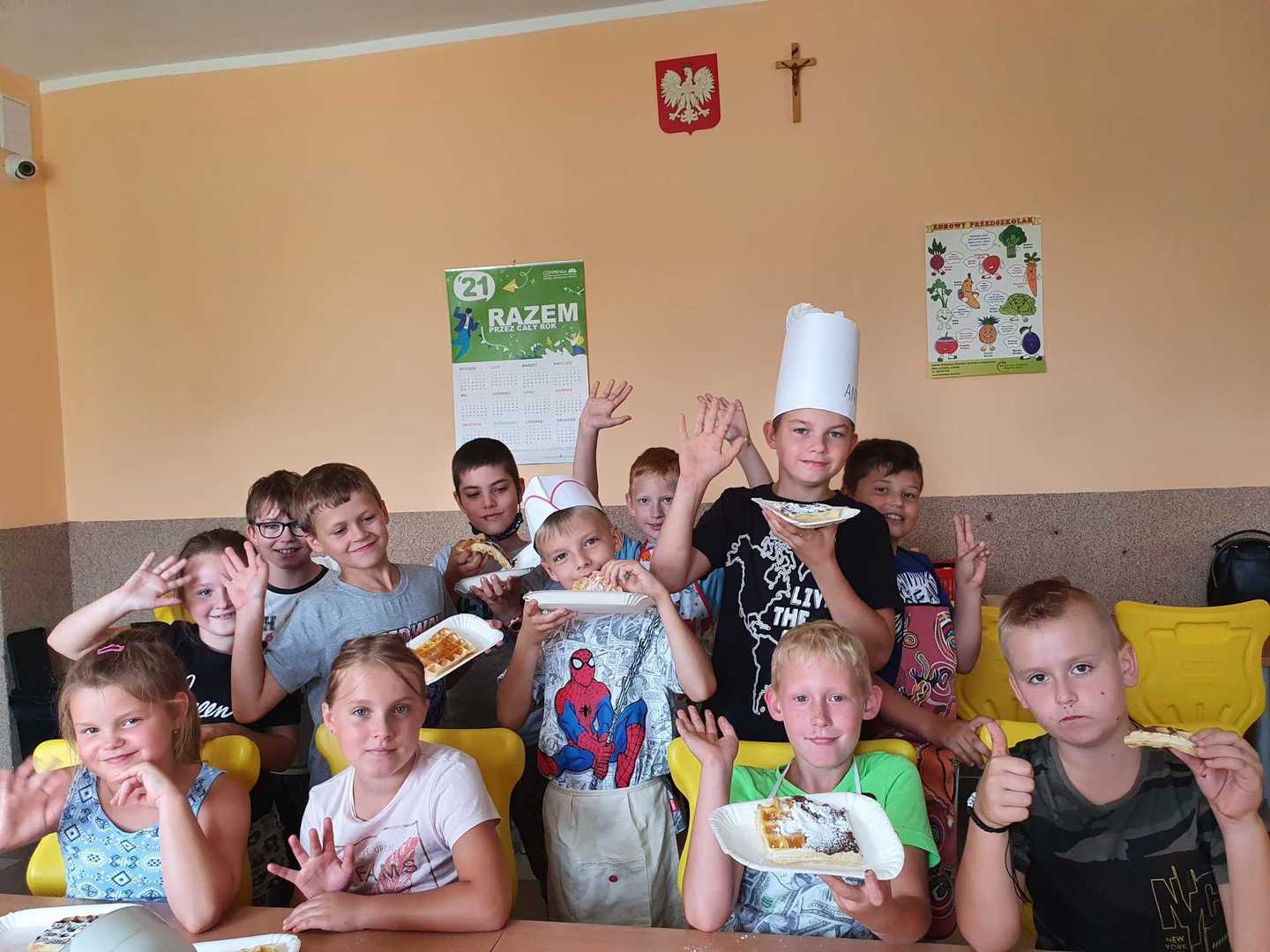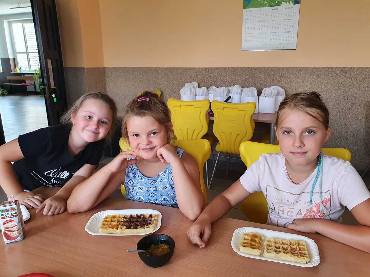 Drugiego dnia półkolonii po przypomnieniu zasad prawidłowego zachowania i zajęciach profilaktycznych nt. radzenia sobie w trudnych sytuacjach stresowych oraz smacznym śniadanku uczniowie udali się na zajęcia taneczne prowadzone przez Panią Martę Smołę z MGOK w Woźnikach. Poznali nowe kroki i style oraz nauczyli się nowej choreografii, dzięki czemu dzieci na pewno nie zaznały nudy. Po aktywie spędzonym czasie samodzielnie zgodnie z przepisem przygotowaliśmy i upiekliśmy gofry, które później wspólnie zjedliśmy. Było pysznie.
