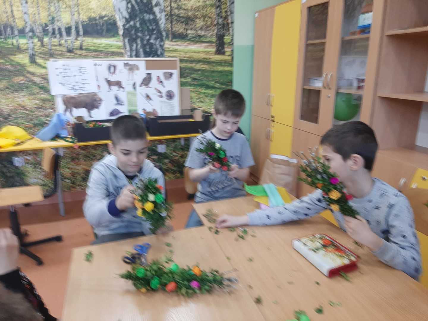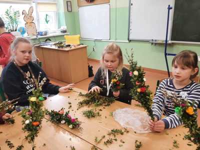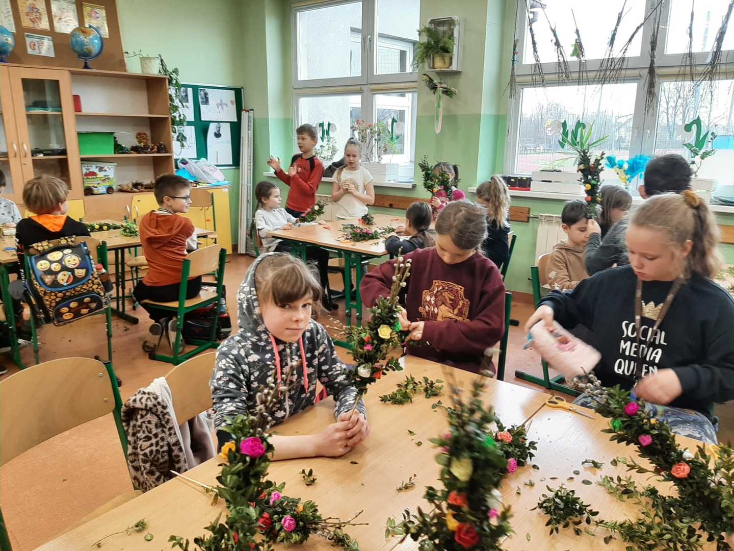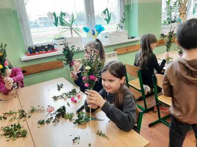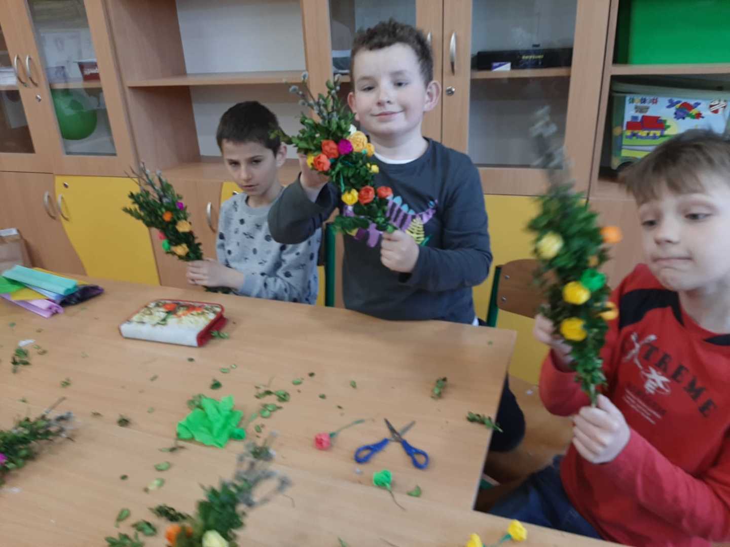 Uczniowie klas 1-3 mogli pod okiem jednej z mam - pani Beaty Podgarbi wykonywali śliczne palmy wielkanocne. Wszystkie materiały roślinne oraz piękne kwiatuszki przygotowała za darmo pani Beata Podgarbi. Uczniom bardzo podobały się te zajęcia, a wykonane własnoręcznie palmy zabrali do domu.