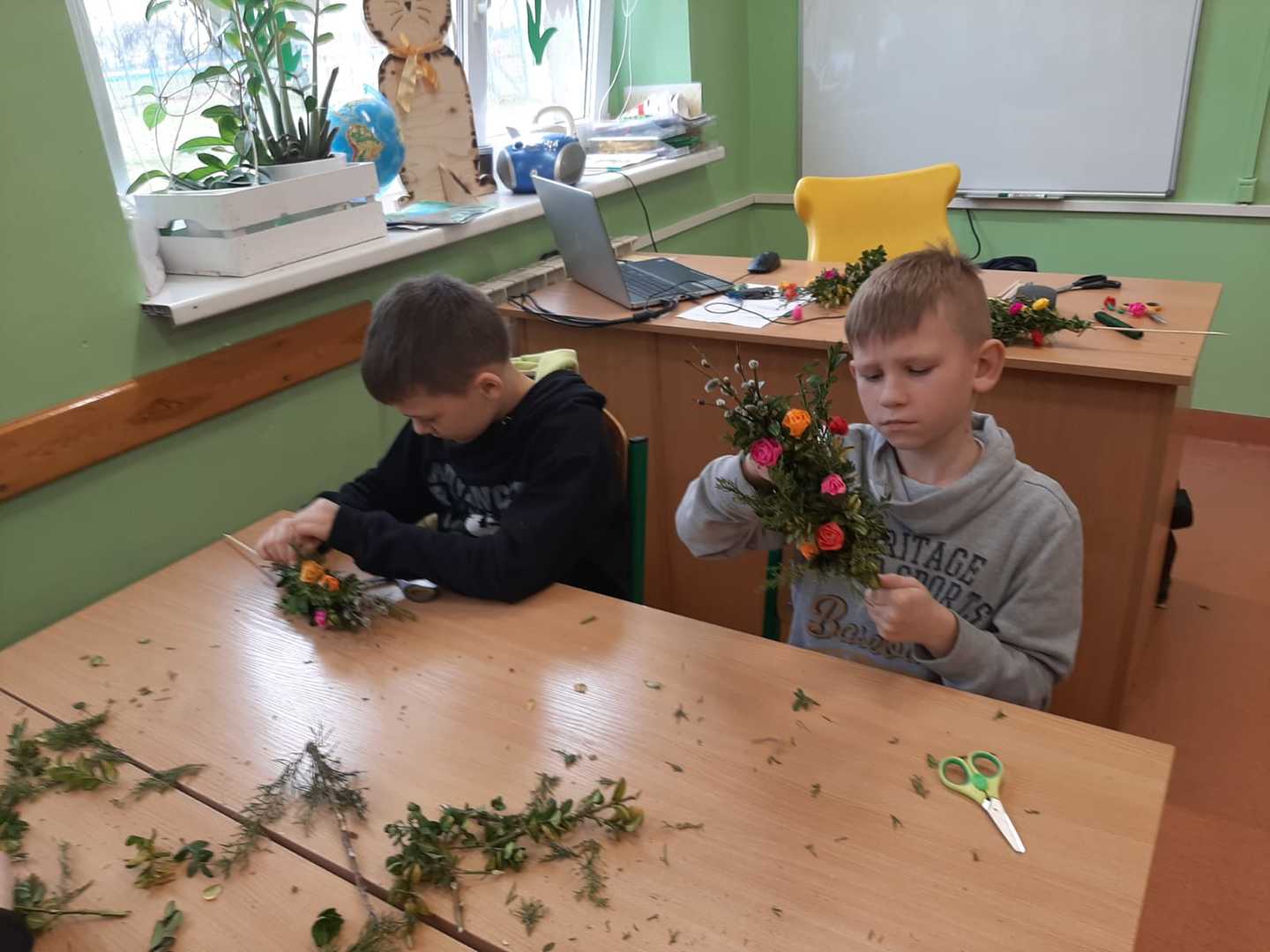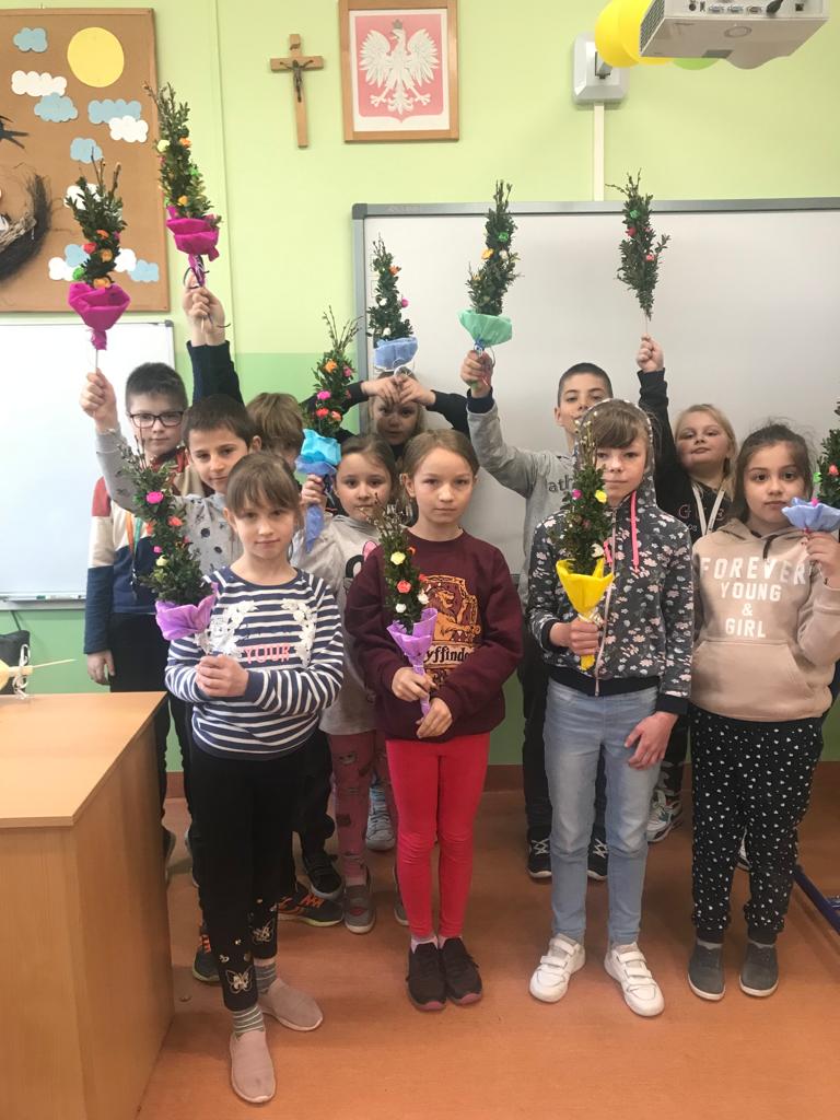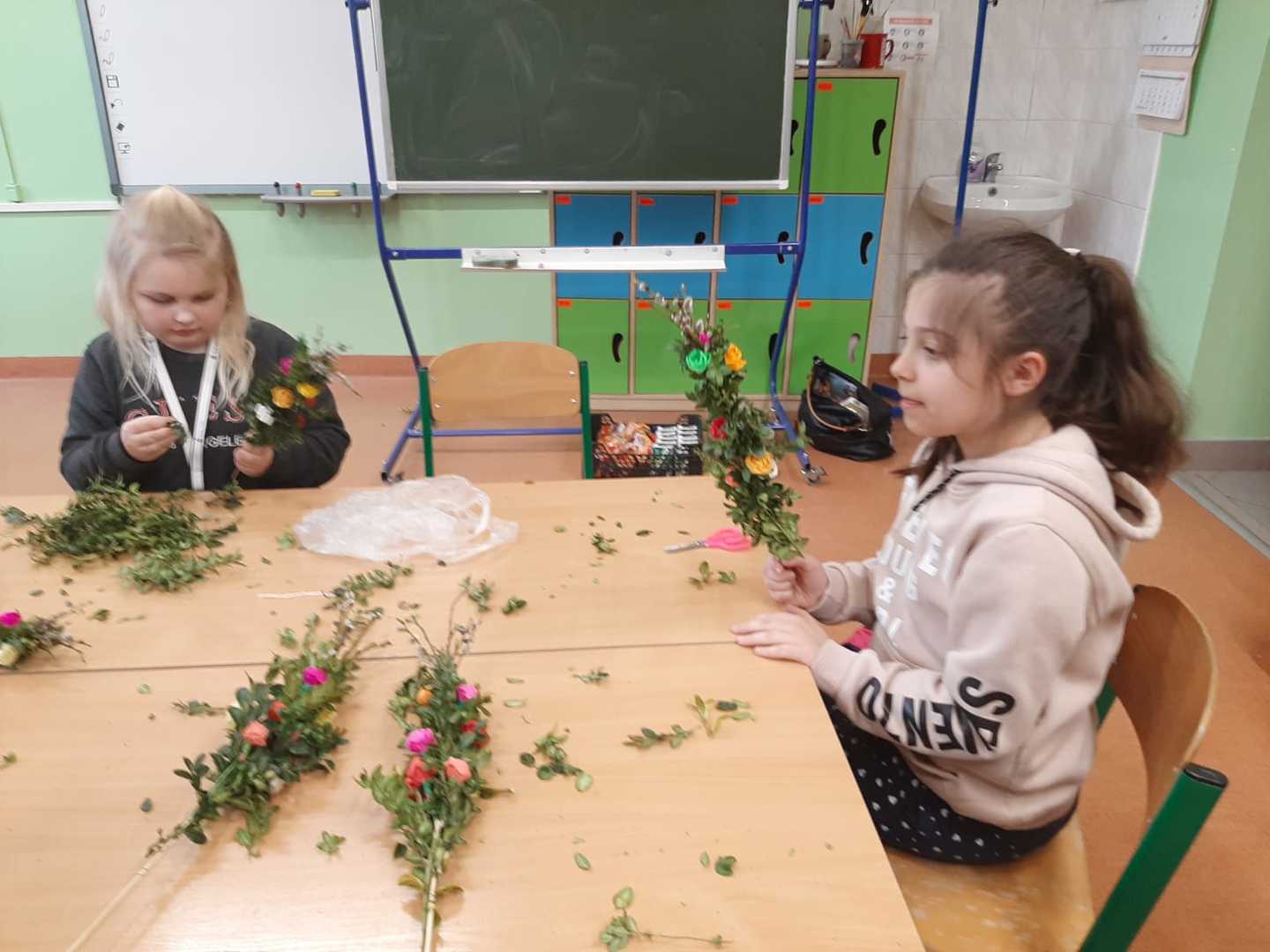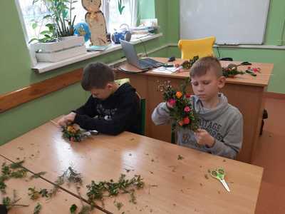 Uczniowie klas 1-3 mogli pod okiem jednej z mam - pani Beaty Podgarbi wykonywali śliczne palmy wielkanocne. Wszystkie materiały roślinne oraz piękne kwiatuszki przygotowała za darmo pani Beata Podgarbi. Uczniom bardzo podobały się te zajęcia, a wykonane własnoręcznie palmy zabrali do domu.