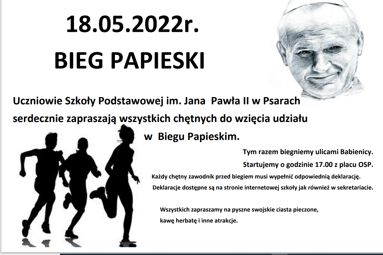 ZAPRASZAMY NA BIEG PAPIESKI Zdjęcia Załączniki plakat na bieg papieski 2022pdf [466.84 kB] Zgoda na Bieg Papieski 2022 [14.54 kB] Zobacz również Wycieczka do Krasiejowa i Opola Wycieczka do Warszawy Wycieczka do Krakowa i Wieliczki ZAPRASZAMY NA BIEG PAPIESKI Bieg Papieski 2022 Ogólnopolski Turniej Bezpieczeństwa Ruchu Drogowego 13 maja 2022 Aktualności Wydrukuj Udostępnij Wyświetlono: 242