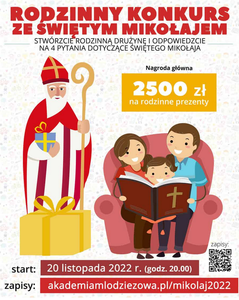 serdecznie zapraszamy rodziny dzieci ze społeczności szkolnej do udziału w Rodzinnym Konkursie ze świętym Mikołajem Akademii Młodzieżowej prowadzonej przez Fundację Szczęśliwe Dzieciństwo. Uczestnicy konkursu tworzą rodzinne drużyny, które muszą odpowiedzieć na 4 pytania dotyczące świętego Mikołaja zawarte w krótkich filmikach publikowanych w Internecie.