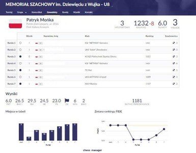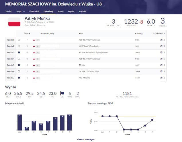 miejsce z taką samą ilością punktów jak zwycięzca turnieju, o miejscu na podium zadecydowały punkty „buchholza”, których Patryk nie ze swojej winy miał najmniej z całej trójki (przeciwnik Patryka z 1 rudny nie dotarł na turniej).