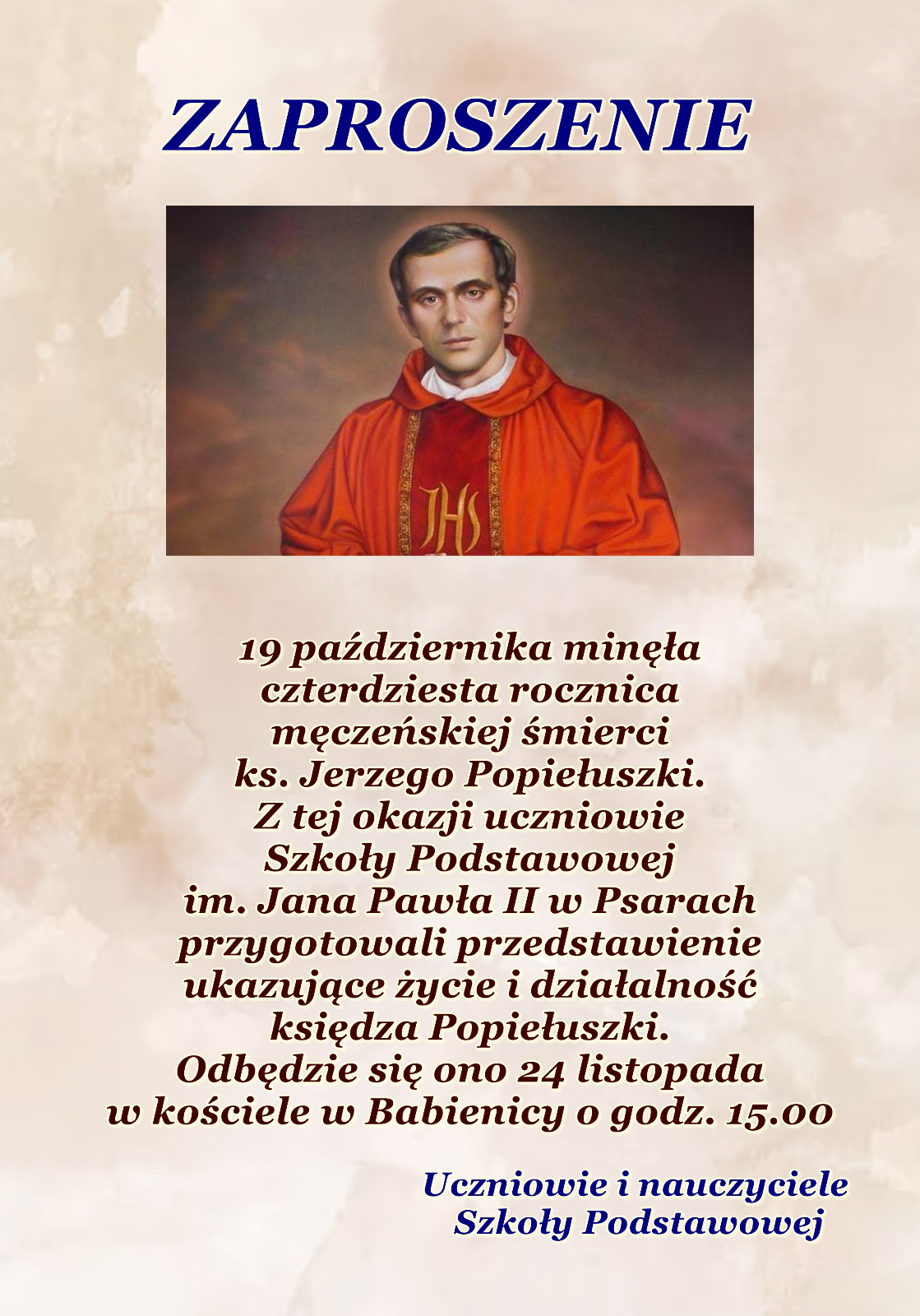 Zaproszenie Zdjęcia Zobacz również Każde Dziecko tak potrafi Akademia z okazji odzyskania niepodległości Konkurs na najpiękniejszy różaniec Zaproszenie Zakończenie udziału w programie "Umiem pływać" Przedstawienie o ks. Jerzym Popiełuszcze 18 listopada 2024 Aktualności Wydrukuj Udostępnij Wyświetlono: 87