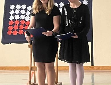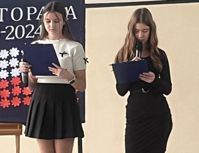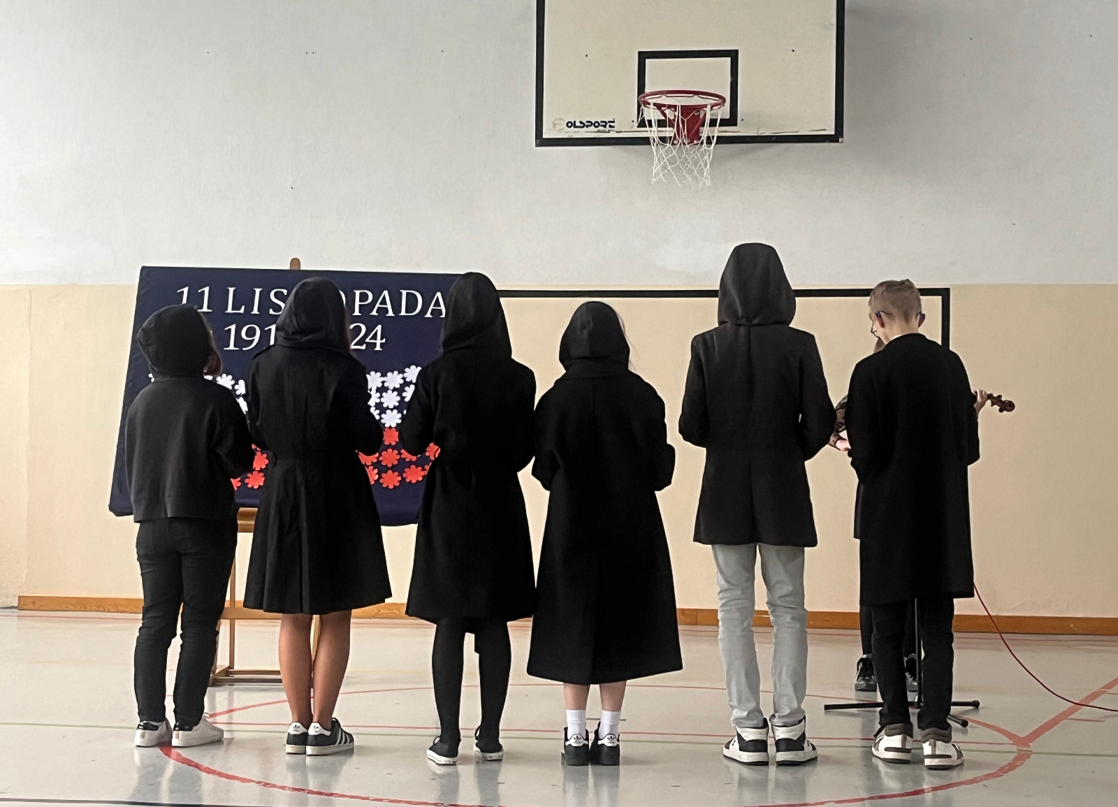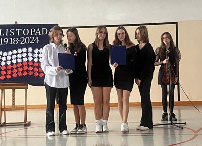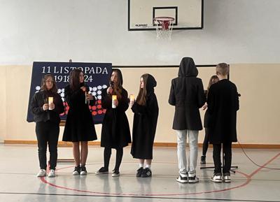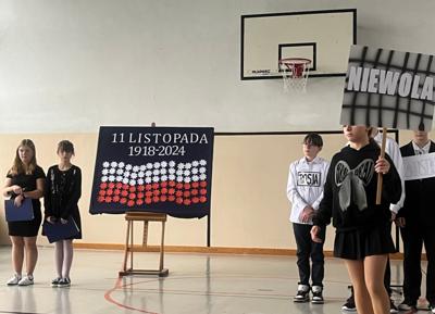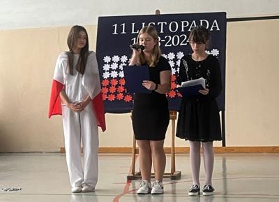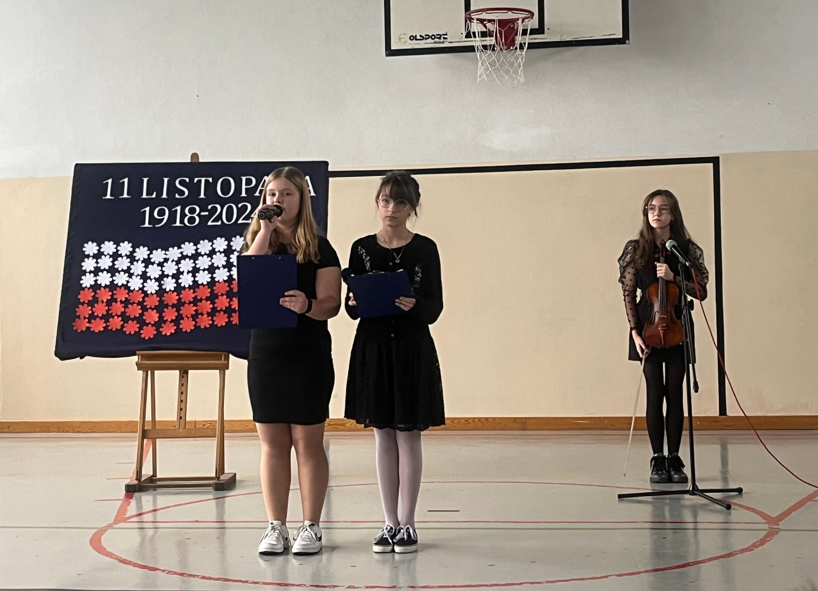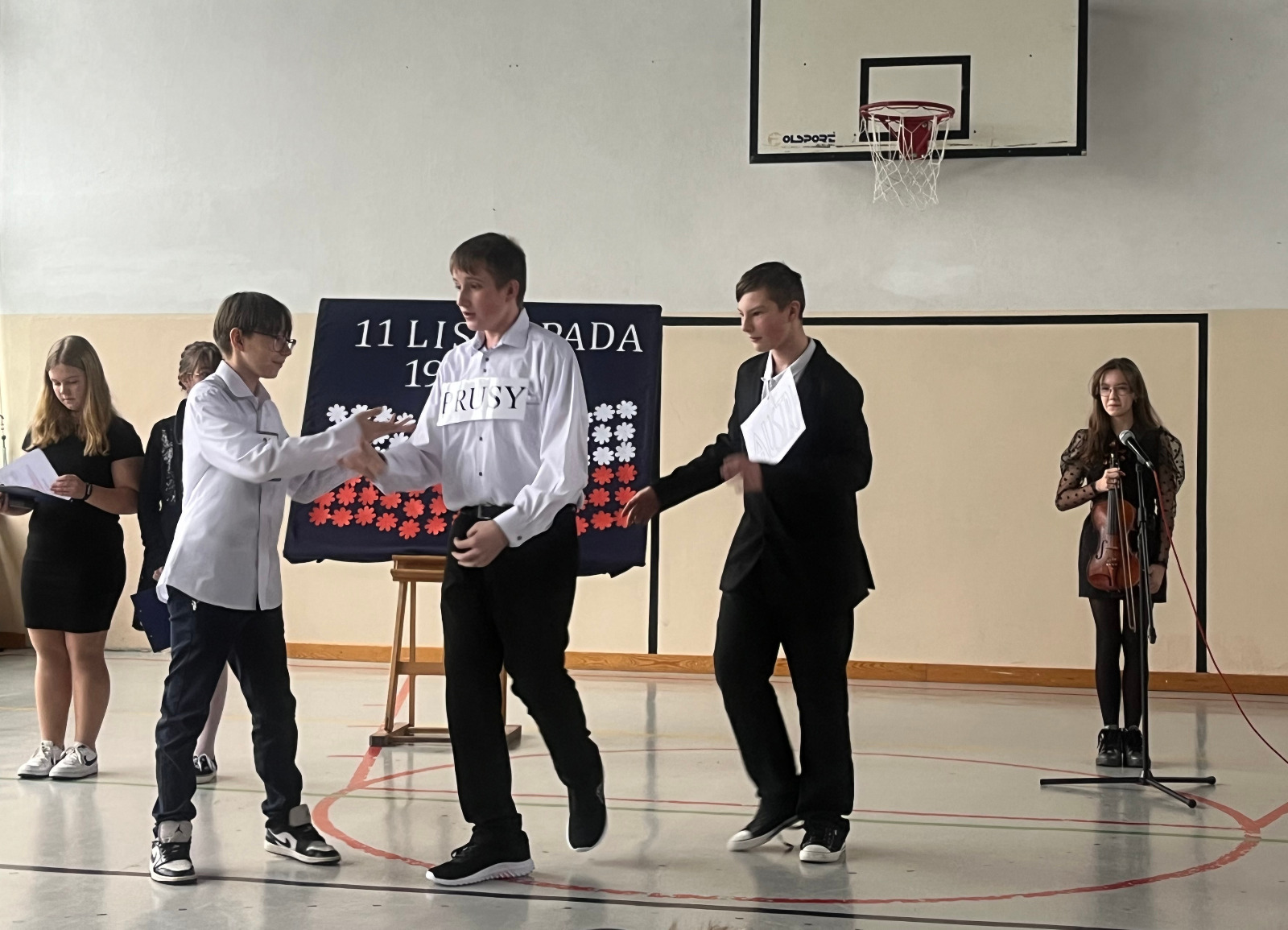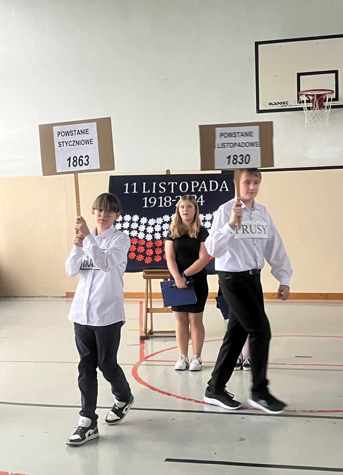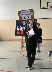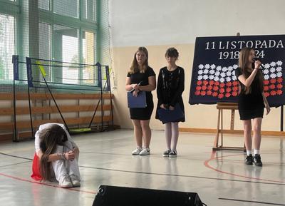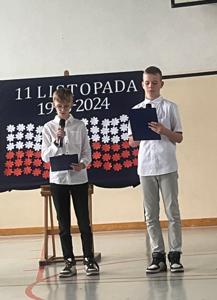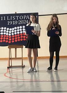 Uczniowie naszej szkoły jak co roku świętowali kolejną rocznicę odzyskania niepodległości. Podczas uroczystej akademii 7 klasa przypomniała ważne fakty historyczne, przedstawiono również okolicznościowe wiersze i piosenki.