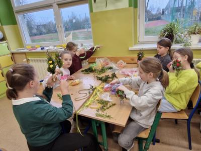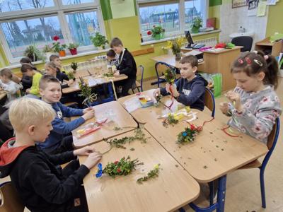 11 kwietnia dzieci z klas młodszych wykonały palmy wielkanocne uczestnicząc w warsztatach, które przygotowała i poprowadziła Pani Beata Podgarbi - mama jednego z uczniów. Pani Beata hobbystycznie zajmuje się rękodziełem i zgodziła się zrobić z dziećmi takie prace.