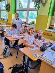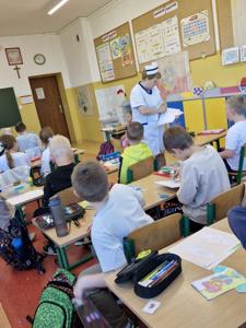 Od kwietnia do maja 2025 roku w naszej szkole odbyło się kilka spotkań - prelekcji dla uczniów klas 1–3 na temat zawodu pielęgniarki. Spotkanie poprowadziła pani Małgorzata Musik, która pracuje jako pielęgniarka w ośrodku zdrowia oraz pełni funkcję higienistki w naszej szkole. Pani Małgorzata w ciekawy i przystępny sposób opowiedziała dzieciom o swojej codziennej pracy. Wyjaśniła, że pielęgniarka pomaga chorym, wykonuje zastrzyki, mierzy temperaturę i ciśnienie, a także troszczy się o higienę i dobre samopoczucie pacjentów. Opowiedziała również o swojej roli jako szkolnej higienistki – podkreśliła, jak ważna jest profilaktyka zdrowotna i dbanie o czystość oraz zdrowy tryb życia. Dzieci mogły z bliska zobaczyć niektóre przyrządy medyczne, takie jak stetoskop czy termometr, i dowiedziały się, do czego służą. Pani Małgorzata pokazała także, jak poprawnie myć ręce, by unikać zarazków. Uczniowie z zainteresowaniem słuchali, zadawali pytania i dzielili się swoimi doświadczeniami.