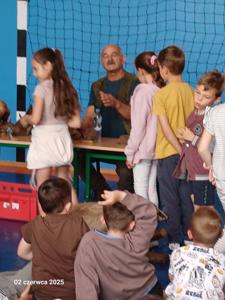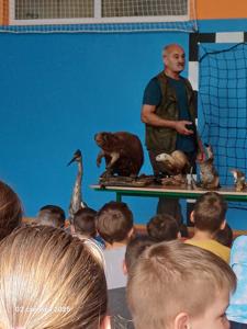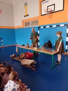 W dniu 2.06.25 uczniów klas I-III odwiedził leśniczy, pan Czesław Tyrol. W ciekawy i barwny sposób opowiadał o florze i faunie okolic, w których mieszkamy, a szczególnie rezerwatu Góra Grójec. Swoją opowieść poparł wypreparowanymi okazami zwierząt, które przyniósł z sobą. Dzieci z zainteresowaniem oglądały i zadawały Panu leśniczemu mnóstwo pytań. Było to dla nich nie lada atrakcją.