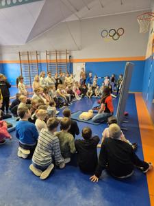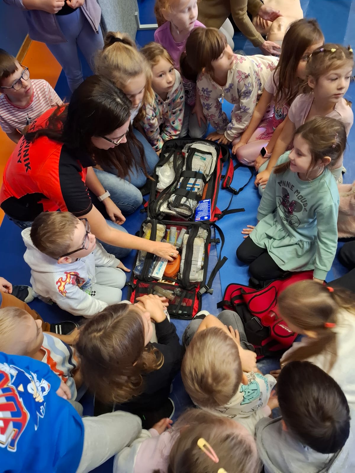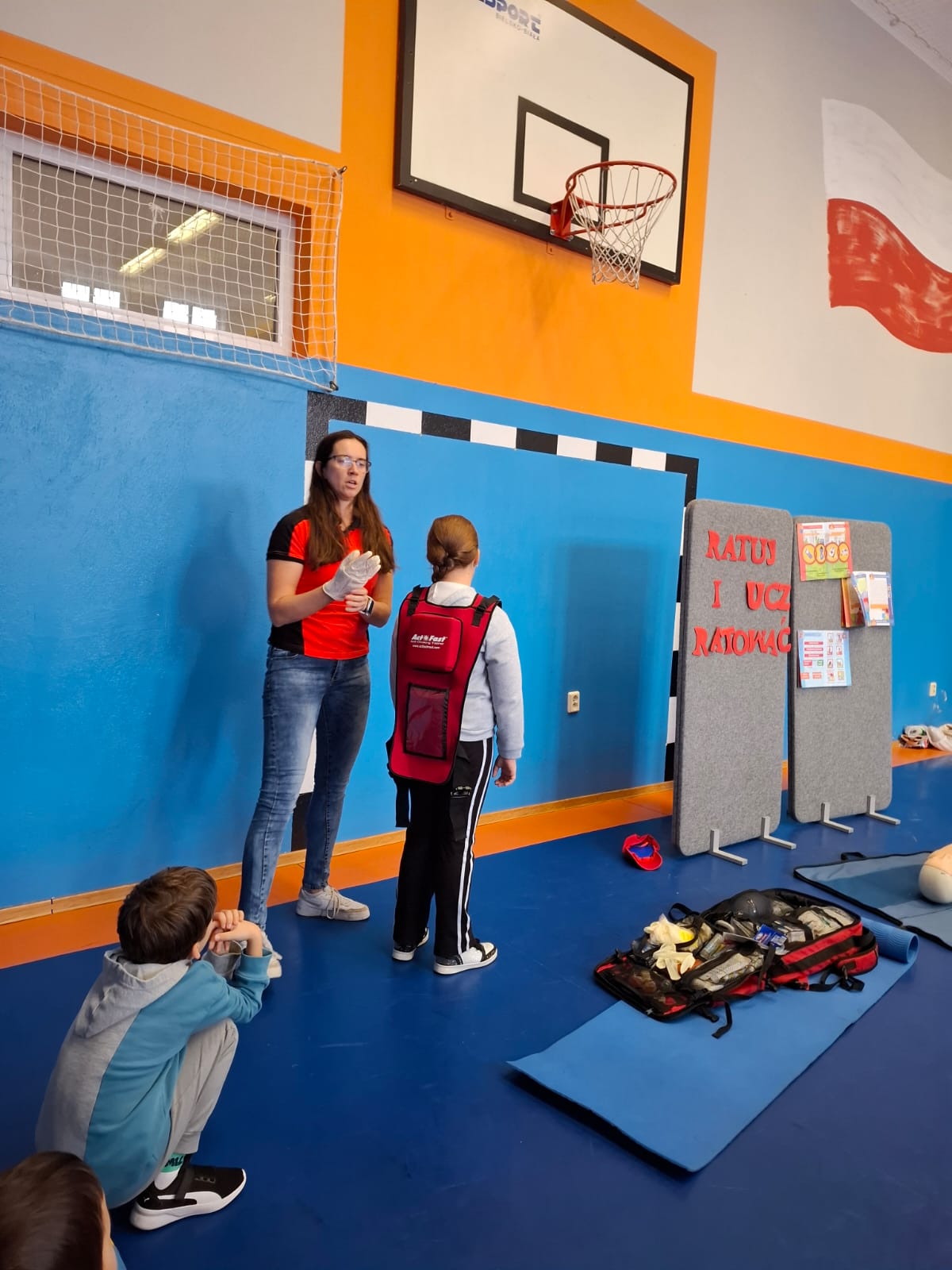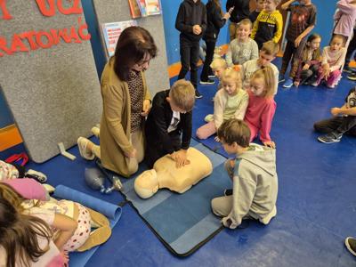 Z tej okazji odbyło się spotkanie z panią ratownik, która opowiedziała uczniom o zasadach udzielania pierwszej pomocy. Każde dziecko miało także okazję spróbować swoich sił w resuscytacji, wykonując uciski klatki piersiowej na fantomie.