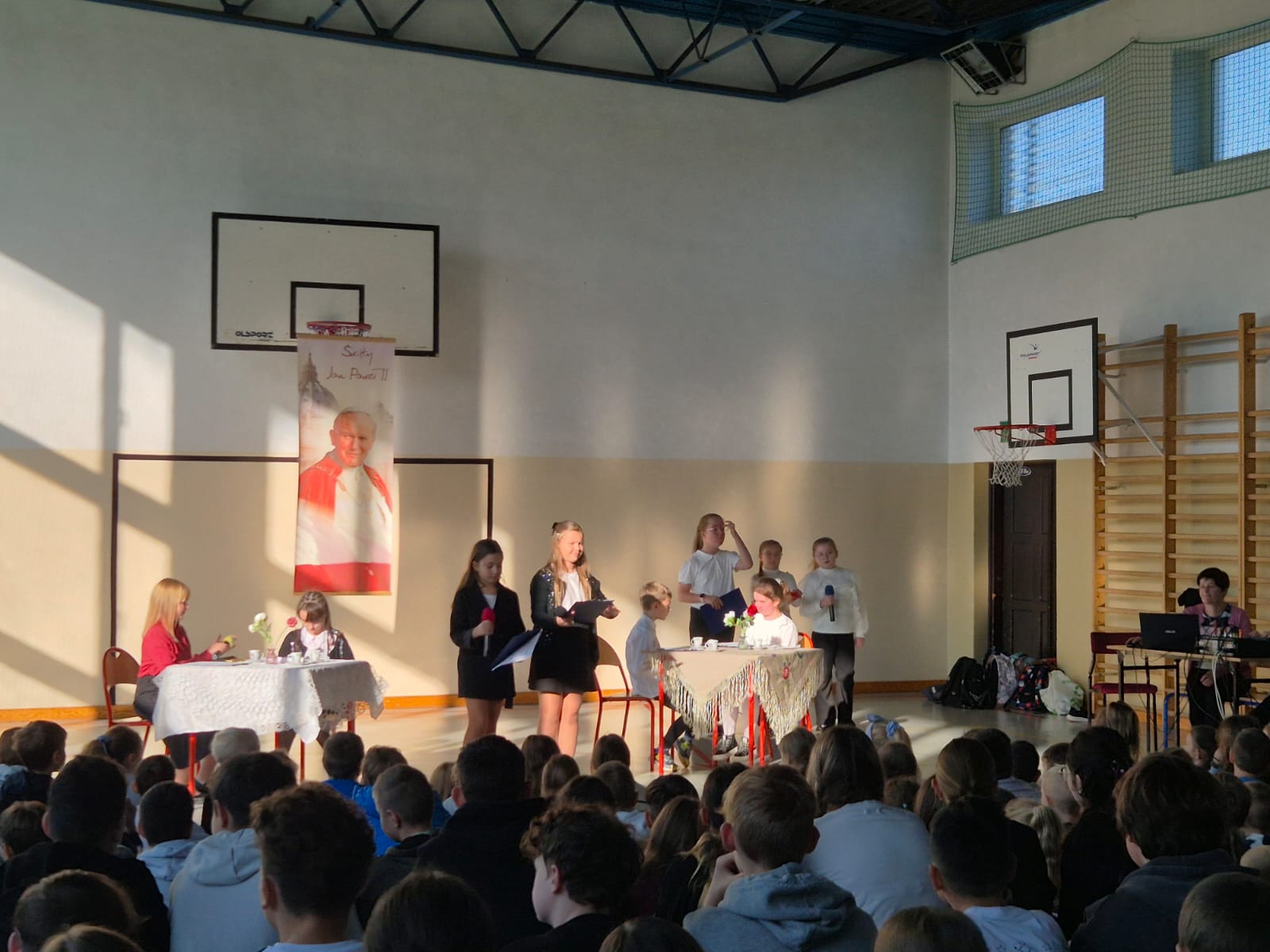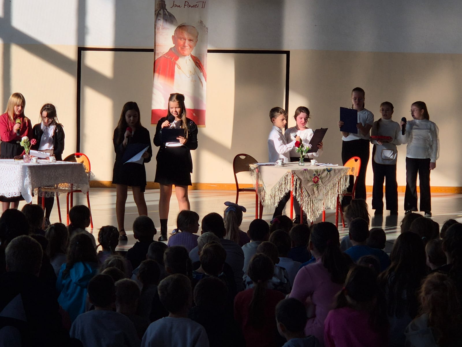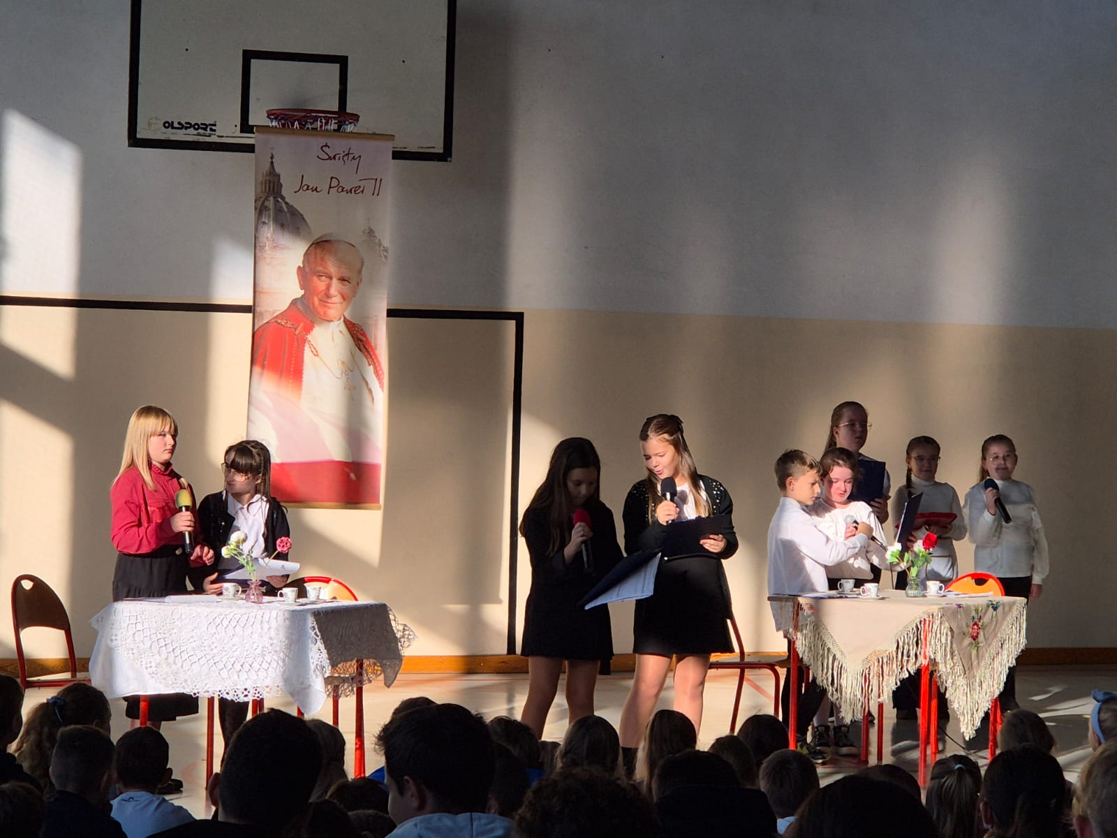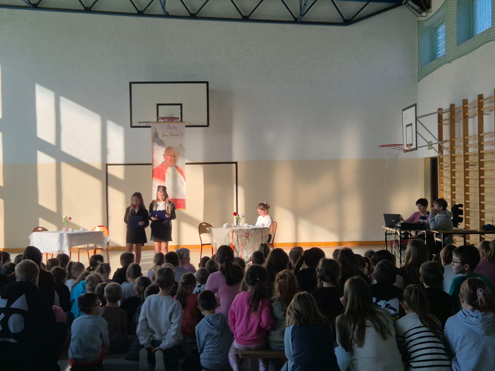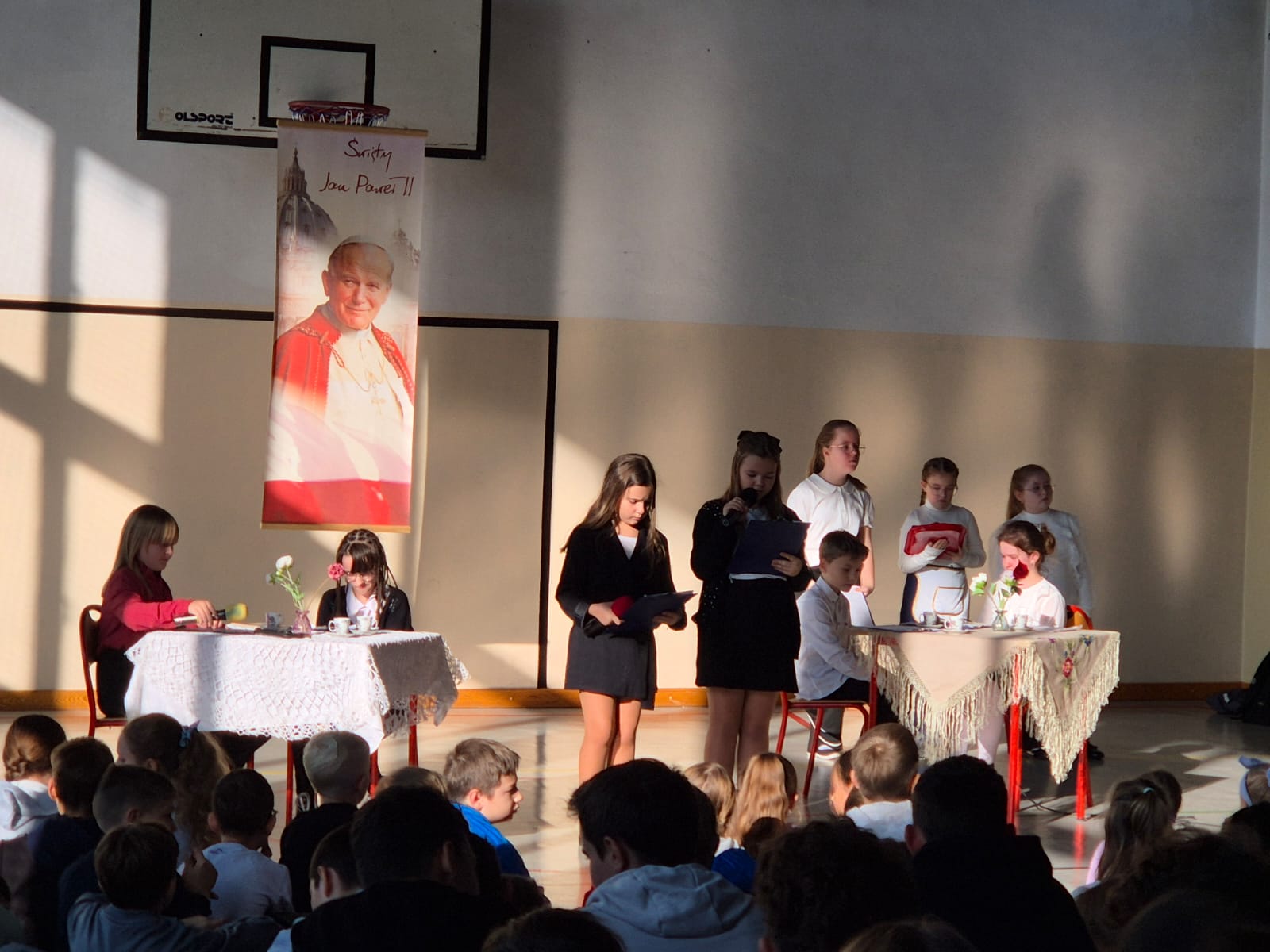 Dziś uczniowie klas czwartych przygotowali krótkie przedstawienie poświęcone św. Janowi Pawłowi II. Uczniowie zaprezentowali najważniejsze momenty z życia papieża Polaka – jego dzieciństwo, młodość, drogę kapłańską oraz pontyfikat. Występ urozmaicony był recytacjami wierszy i śpiewem. Przedstawienie przypomniało wszystkim wartości,