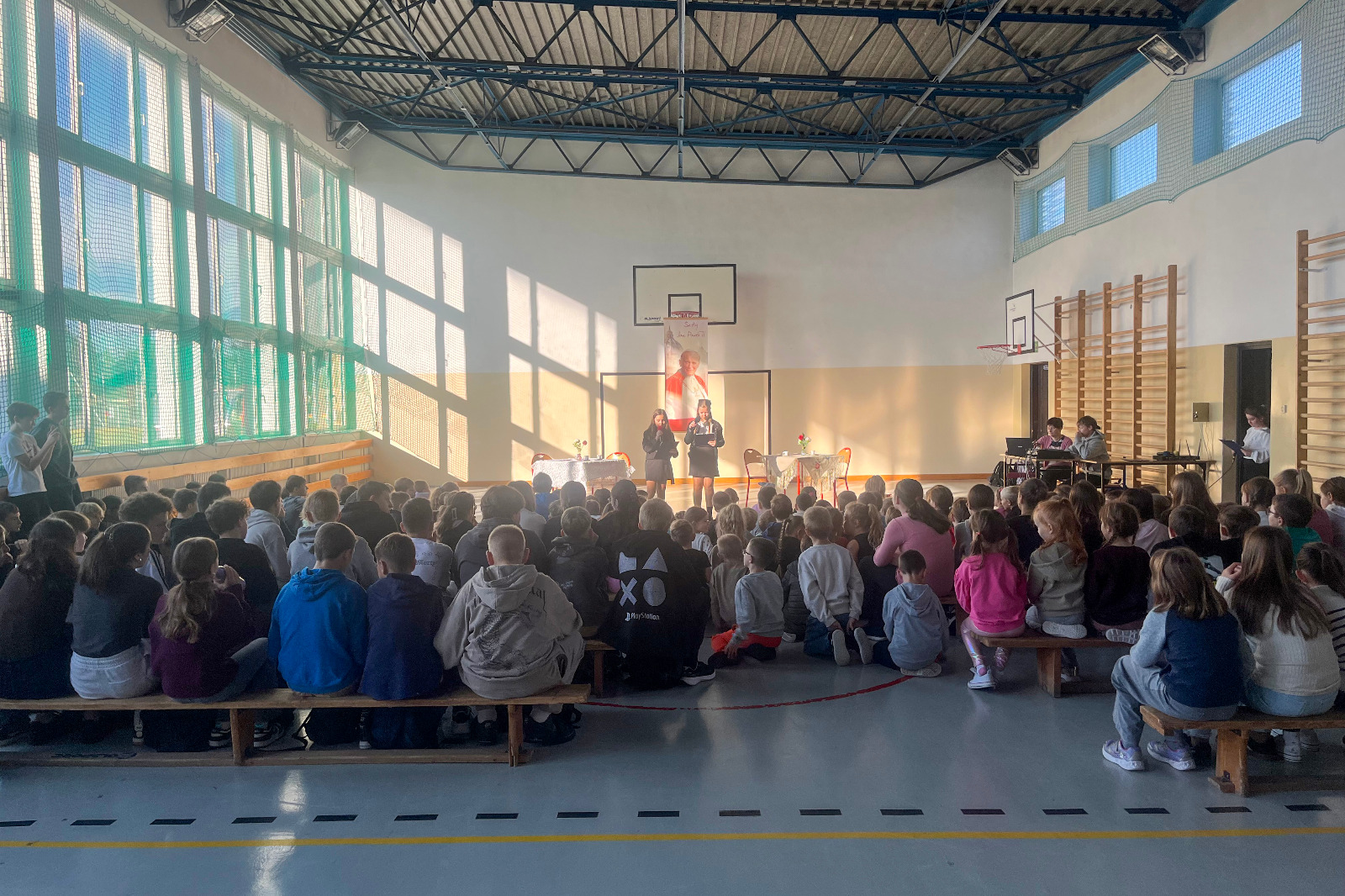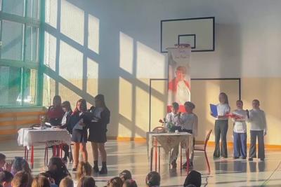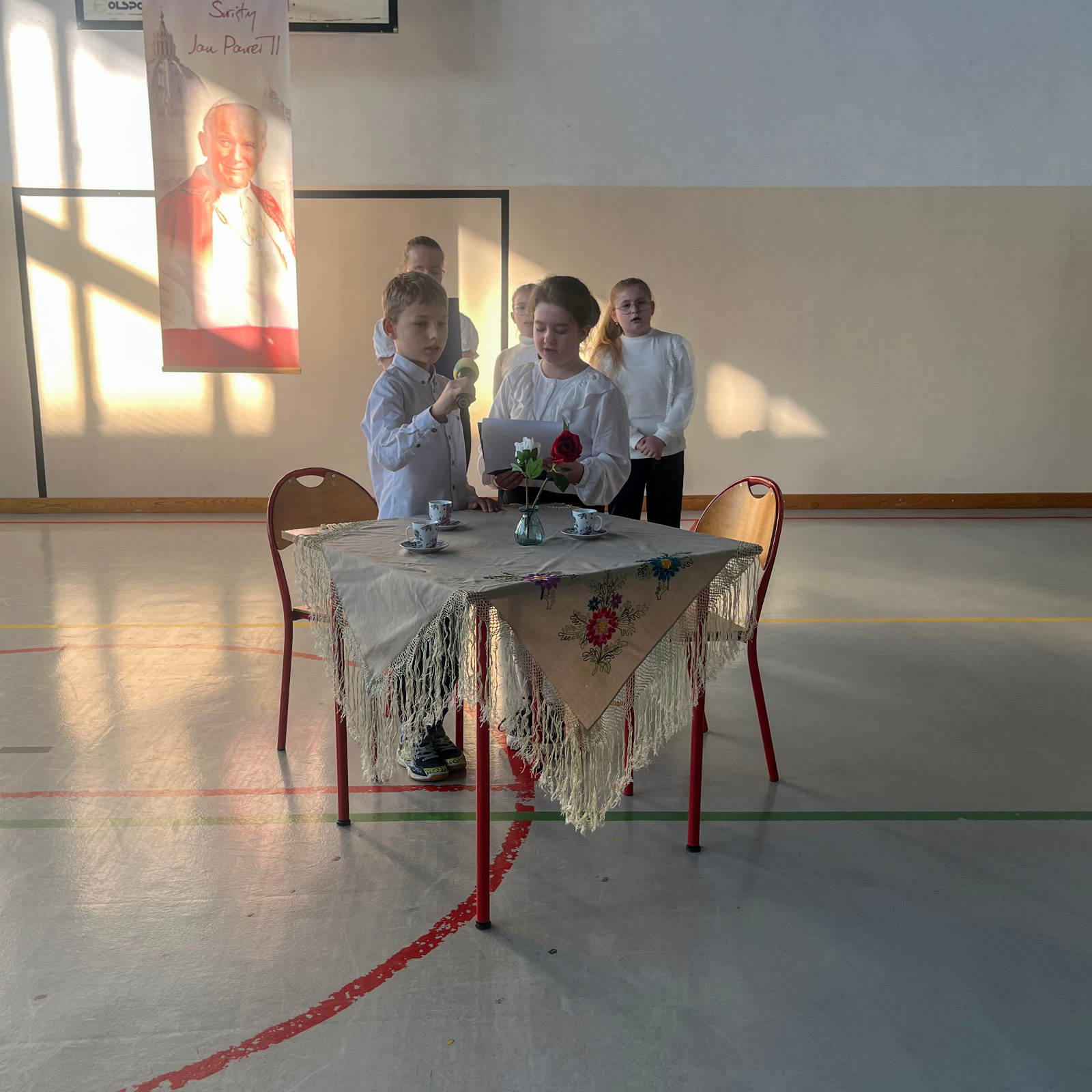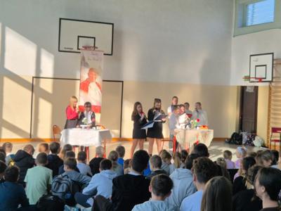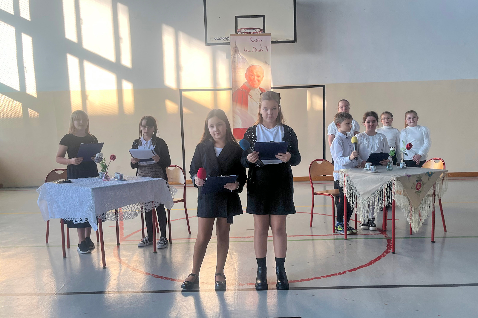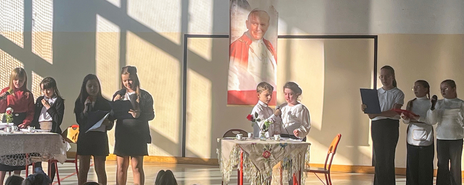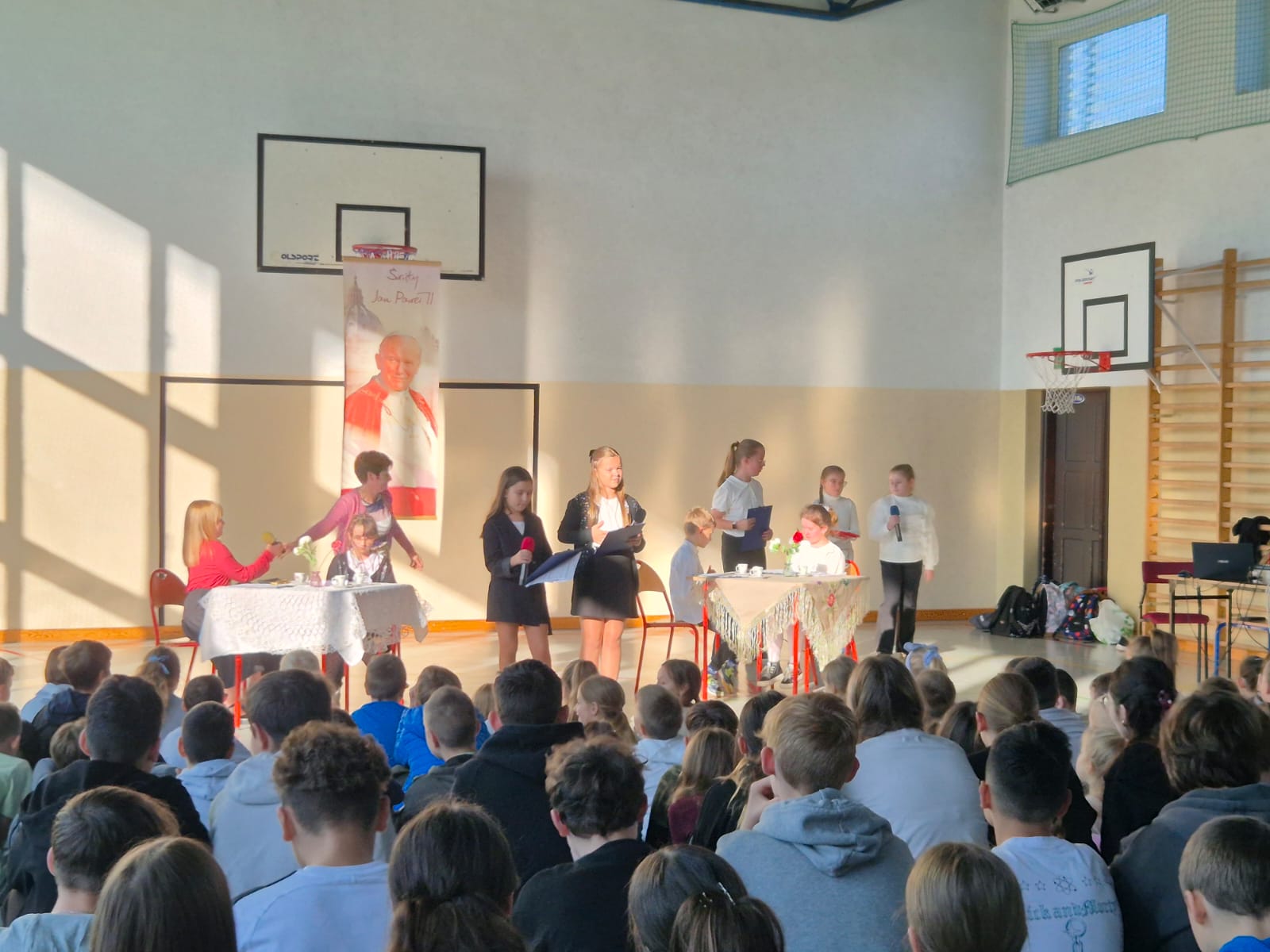 Dziś uczniowie klas czwartych przygotowali krótkie przedstawienie poświęcone św. Janowi Pawłowi II. Uczniowie zaprezentowali najważniejsze momenty z życia papieża Polaka – jego dzieciństwo, młodość, drogę kapłańską oraz pontyfikat. Występ urozmaicony był recytacjami wierszy i śpiewem. Przedstawienie przypomniało wszystkim wartości,
