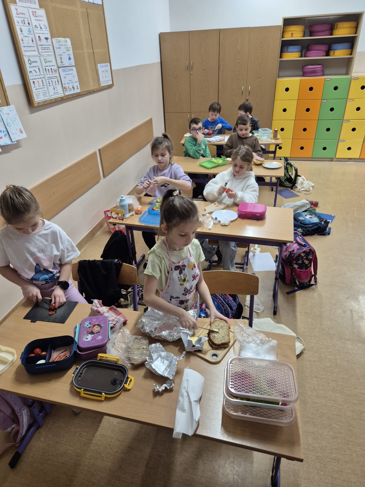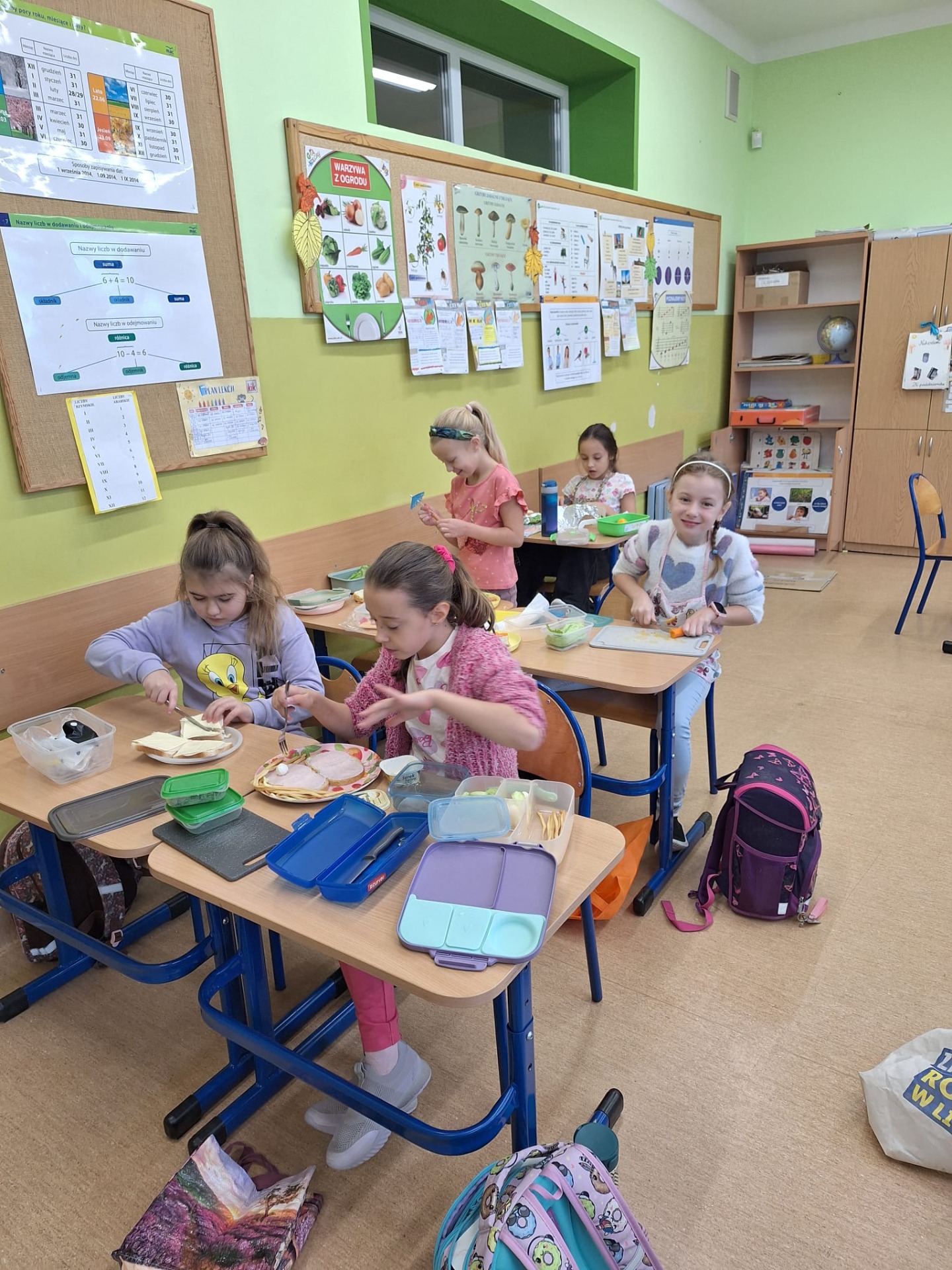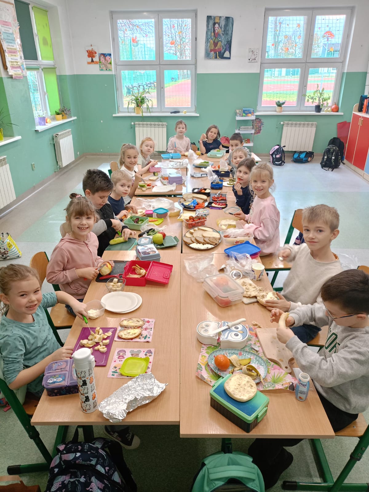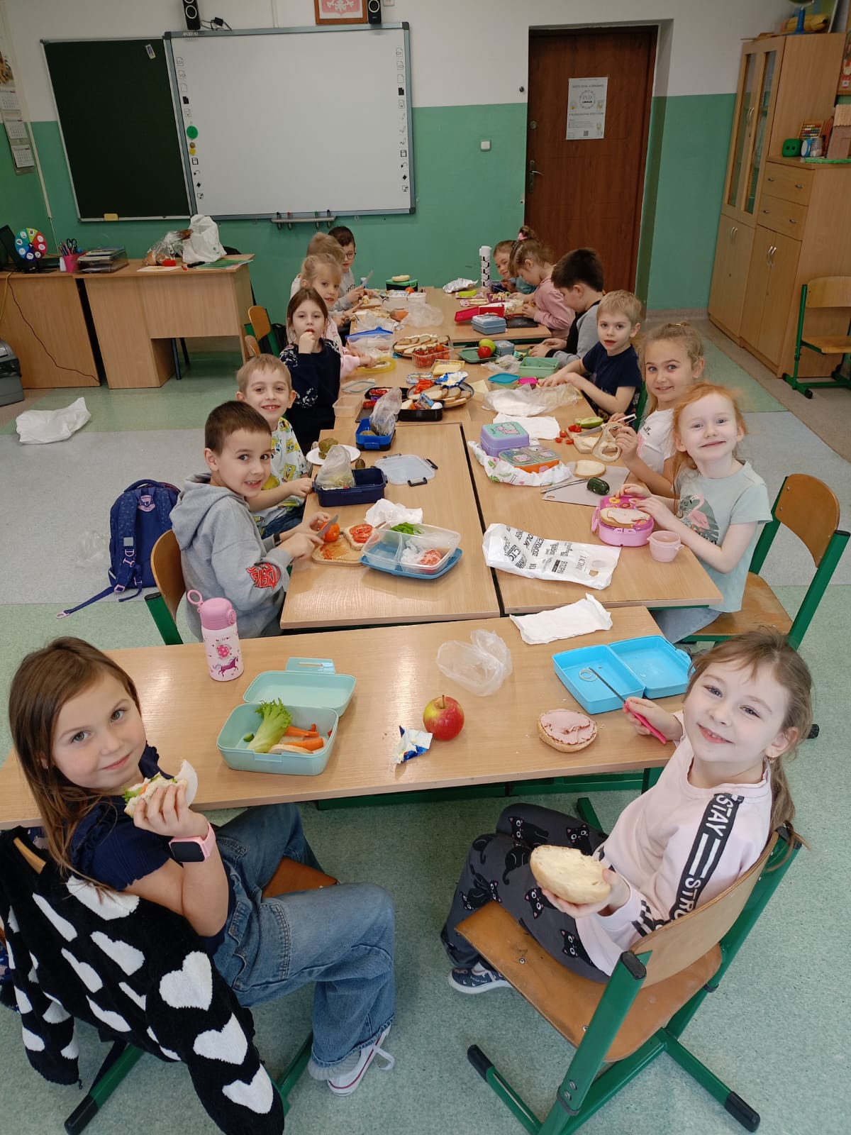 Dzisiaj klasy 1-3 brały udział w akcji ,,Śniadanie daje moc". Poznały zasady przygotowania zdrowego śniadania oraz jego znaczenie na prawidłowe funkcjonowanie organizmu w ciągu dnia. Każde dziecko samodzielnie przygotowało pyszne kanapki wg swojego pomysłu. Potem nastąpiła degustacja. Była to bardzo ciekawa lekcja samodzielności i kreatywności.