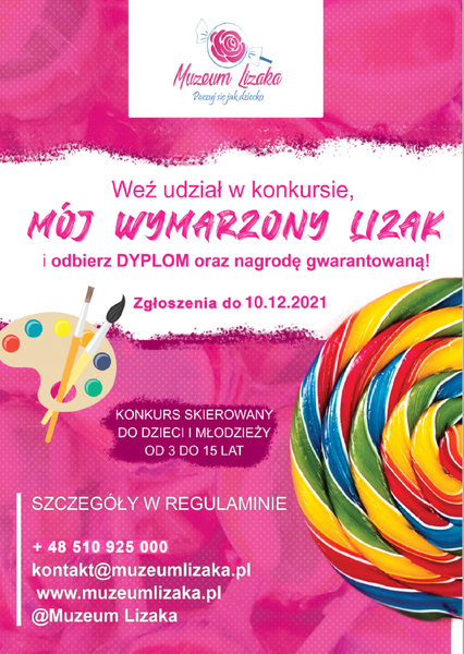 20 września 2021 Konkursy KONKURS PLASTYCZNY Muzeum Lizaka 2021 Szanowni Państwo, Muzeum Lizaka oraz Zespół Szkół Miejskich nr 1 w Jaśle serdecznie zapraszają do wzięcia udziału kolejnej edycji ogólnopolskiego konkursu plastycznego:... Czytaj więcej