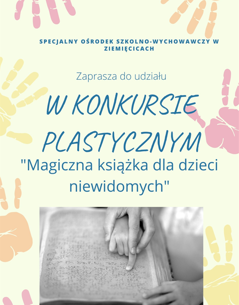 20 września 2021 Konkursy Konkurs plastyczny - „Magiczna książka dla dzieci niewidomych” Regulamin konkursu plastycznego dla dzieci w wieku szkolnym klasy IV – VII „Magiczna książka dla dzieci niewidomych” § 1 Cele konkursu 1. Rozwijanie umiejętności plastycznych... Czytaj więcej