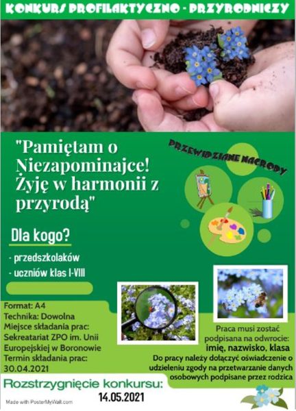 14 kwietnia 2021 Konkursy Konkurs profilaktyczno-przyrodniczy Zapraszamy do udziału w konkursie profilaktyczno-przyrodniczym “Pamiętam o niezapominajce! Żyję w harmonii z przyrodą”. Konkurs adresowany jest do przedszkolaków i uczniów szkoły... Czytaj więcej